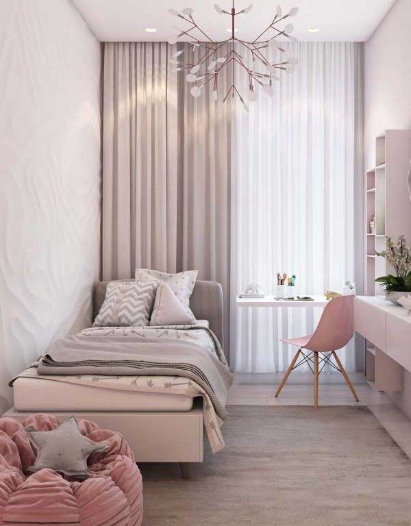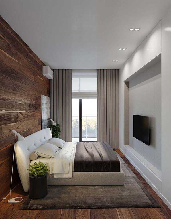 Với những căn phòng có không gian nhỏ, hãy lựa chọn thiết kế tủ âm tường. Tủ âm tường có tối ưu hóa không gian, giúp bạn tiết kiệm được diện tích và căn phòng luôn được gọn gàng. Chú ý tới thiết kế cửa sổ; trong căn phòng này, cửa sổ sát mặt đất giúp “ăn gian” diện tích phòng, lại tạo sự lưu thông không khí thoáng đãng trong phòng.