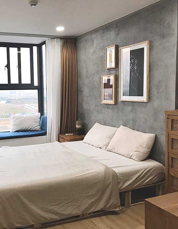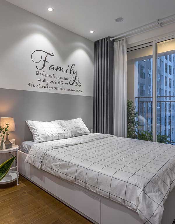 Điểm nhất nổi bật của căn phòng này là gì? Đó chính là bức tường sơn màu xám. Màu xám là một tone màu trung tính, là sự pha trộn của màu trắng và màu đen, mang lại vẻ đẹp sang trọng, hiện đại. Màu xám kết hợp ăn ý với rất nhiều tone màu, do đó bạn có thể thoải mái lựa chọn nội thất, mang tới sự tĩnh lặng và an nhiên cho không gian phòng ngủ.