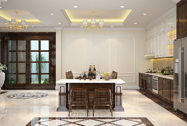 Lựa chọn tone màu sáng, ví dụ như màu trắng để làm căn phòng trở nên thông thoáng, sáng sủa hơn rất nhiều. Kết hợp cùng trần thạch cao tương đồng màu cũng được xem là thiết kế thông minh để phòng bếp trở nên sạch sẽ và cao ráo, thông thoáng hơn.
