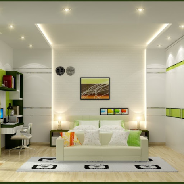 Với những căn phòng mang tính hiện đại, mục đích nghỉ ngơi thì việc lựa chọn trần thạch cao với màu sắc trắng, phẳng trơn, không kèm họa tiết chắc chắn lựa chọn phần đa người sử dụng. Kết hợp cùng hệ thống đến được bố trí từng khoảng tạo nên không gian yên tĩnh, thích hợp cho việc nghỉ ngơi của gia chủ.