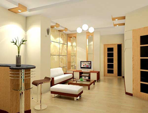 Không gian phòng khách này khá khiêm tốn nhưng khi nhìn vào chúng ta sẽ thấy nó thật sự rất thoáng đãng và sáng sủa, bởi cách chọn màu sơn, nội thất lấy tông màu sáng là chủ đạo rồi trần thạch cao kết hợp gỗ cũng rất sáng sủa. Tất cả kết hợp bố trí hài hòa tạo nên một căn phòng đầy cá tính sắc nét.