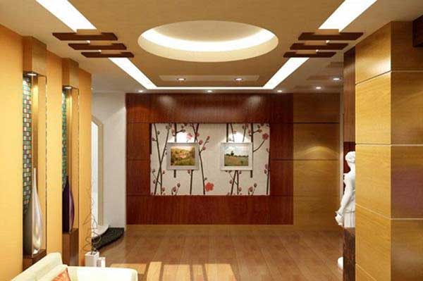 Mẫu thiết kế trần thạch cao này khá đơn giản tuy nhiên vẻ đẹp của nó thì không thể phủ nhận được. Phần gỗ sử dụng chỉ một ít làm viền xung quanh trần và nổi bật ở giữa là một chiếc đèn. Không gian phòng khách rộng và tông màu chủ đạo của căn nhà là tông màu sáng làm bật lên nét đẹp khác lạ của thiết kế kiểu trần này.