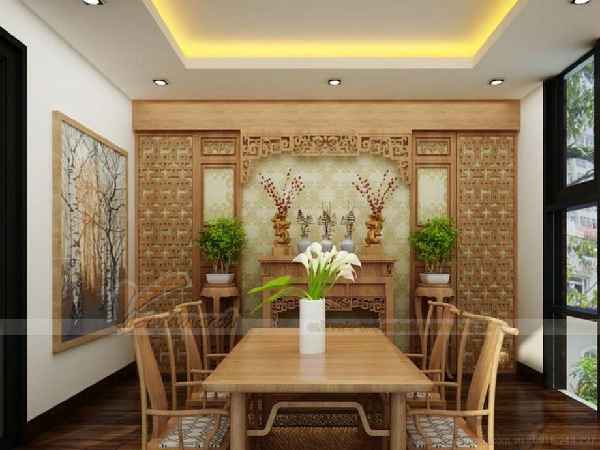 Màu sắc lựa chọn tone màu trắng kết hợp với màu gỗ sáng từ nội thất ban thờ. Phần tường bên tay trái chỉ là bức tranh cây cảnh đen trắng đóng khung gỗ viền bao quanh. Còn bên phải là hệ thống cửa sổ để lấy ánh sáng tự nhiên cũng như trao đổi không khí trong không gian. Hai bên khu vực bàn thờ là hai chậu cây xanh. Tường phía sau ban thờ được dán giất hoạ tiết phù hợp. Trong không gian này gia chủ đặt một chiếc bàn dài với 4 ghế đi cùng. Bên trên đặt một bình hoa có thiết kế đơn gian và bên dưới đặt một chiếc thảm. Còn trần nhà thì kiến trúc sư lựa chọn mẫu trần thạch cao giật cấp đơn giản. Mẫu trần thạch cao này có gắn đèn led nhỏ ánh sáng trắng xung quang viền khung, bên trong khu vực giật cấp bố trí ánh sáng chạy theo. Và không sử dụng thêm hoạ tiết hay đèn gắn trần nào.