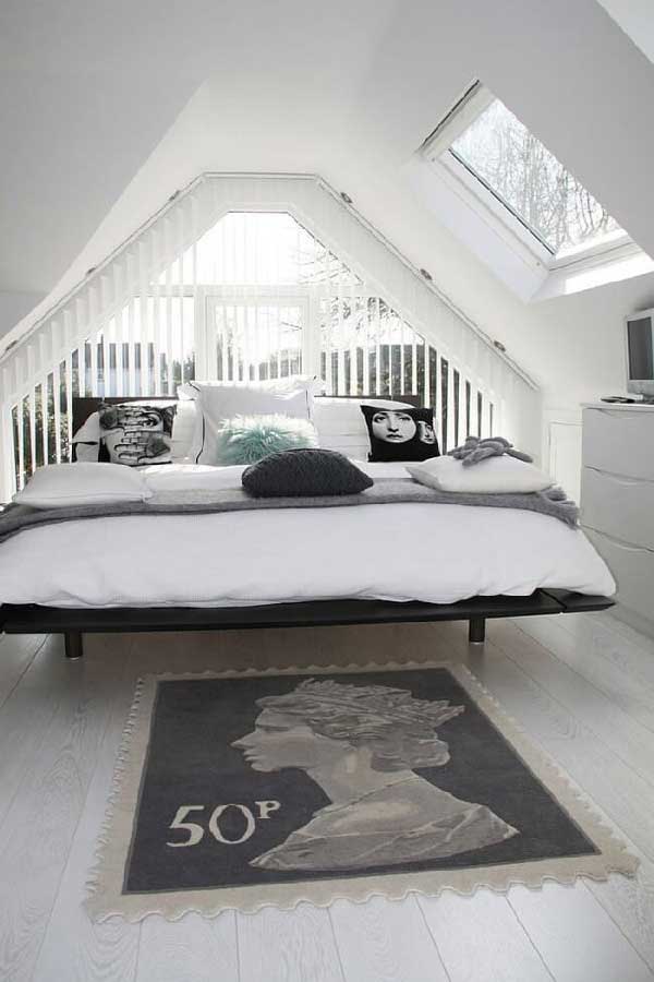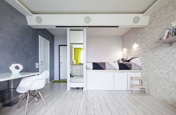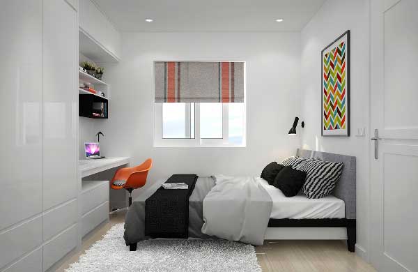 Tuân thủ phương pháp thiết kế đơn giản với quy tắc về màu sắc trắng được sửu dụng trong thiết kế hợp với đồ nội thất thông minh, đáp ứng đủ một không gian 15m2 nhưng đầy đủ tiện nghi cho gia chủ. Một chiếc giường cao hơn rất nhiều so với bình thường bởi phía dưới gầm là tủ đồ có thể kéo ra để đựng quần áo hay những vật dụng cần thiết. Phía đuôi giường là chiếc gương kết hợp tủ dạng đứng. Mọi thứ bé nhỏ nhưng mang trong mình đầy công năng.