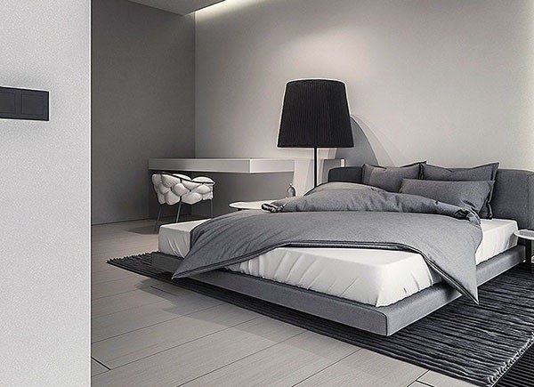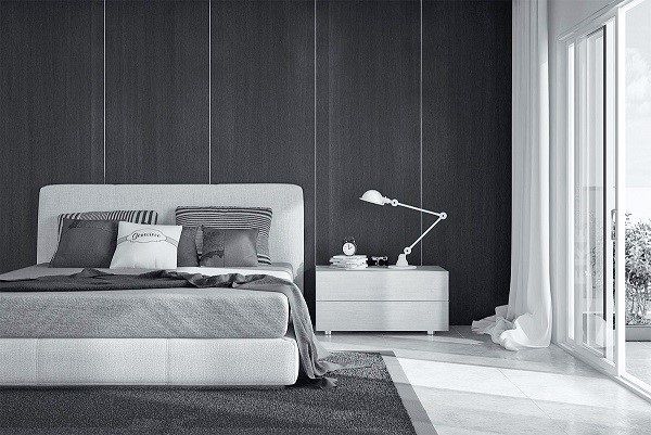 Đặt màu đen trong không gian phòng ngủ màu xám và thắt chặt. Một chiếc giường có màn trang trí màu đen được trải trên một tấm thảm với tường xám nhạt, một bên là xám đậm và sàn nhà màu xám. Cơ bản là một bức tường màu xám nhạt nhưng bằng cách kê một bức tường màu xám đậm ở bên, toàn bộ không gian có nội thất rất cân đối. Khung tán đen và những mảng tường sẫm phối 2 bên trái phải nên rất cân đối. Ngoài ra, khung màu đen là toàn bộ không gian tạo nên sự sắc nét của nội thất. Bên cạnh đó, nên điểm xuyết những đồ nội thất màu trắng đen xen vào xám để tạo điểm nhấn. Phối 1 chiếc tủ màu trắng trên nền tường xám đậm khiến nó trở thành một món đồ nội thất vô cùng thời trang cho phòng ngủ. Xám và trắng kết hợp vô cùng ăn ý từ trước tới nay, là sự giao hòa giữa nội thất hiện đại và đương đại. Vấn đề cần chú ý một chút chính là làm cho màu xám của bức tường tối hơn 1 chút, những màu tối vừa phải có thể tận hưởng sự tương phản của màu sắc.