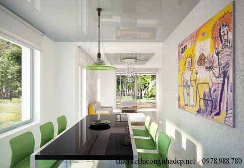 Không gian này sẽ được trang bị một bộ bàn ghế cho 6 người sử dụng vật liệu nhựa xanh nổi bật. Một phần của chiếc bàn sẽ được làm bằng khung kính rộng rãi, tạo điểm nhấn cho nội thất căn phòng. Trong trường hợp bạn muốn sắp xếp thêm chỗ ngồi cho khách, chủ nhà có thể dễ dàng đặt thêm một chiếc ghế. Để ngăn cách nhà bếp và phòng ngủ, một bức tranh treo tường sẽ ở giữa do đó tạo điểm nhấn, tăng tính thẩm mỹ.