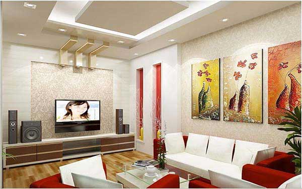 Với mẫu trần thạch cao này, phòng khách trong ngôi biệt thự của bạn sẽ trở nên đẹp và thu hút hơn rất nhiều. Sử dụng gam màu trắng đồng màu với kiến trúc tạo cảm giác rộng, thoáng cho không gian. Kết hợp với những điểm màu nổi bật từ thảm, tranh tường hoàn hảo là sự lựa chọn cho ngôi nhà của bạn.