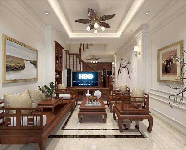 Với một ngôi biệt thự được thiết kế theo phong cách Đông Dương thì đây sẽ là mẫu trần thạch cao biệt thự phù hợp mà bạn có thể tham khảo. Trần được thiết kế giật cấp nhẹ nhàng, kết hợp với đèn led hắt sáng và đèn âm trần nên nó đảm bảo đủ ánh sáng cho không gian. Nội thất gỗ mang đậm chất Á Đông kết hợp với các chi tiết, tranh vẽ trang trí tạo nên một không gian phòng khách đẹp với những nét Á – Âu kết hợp.