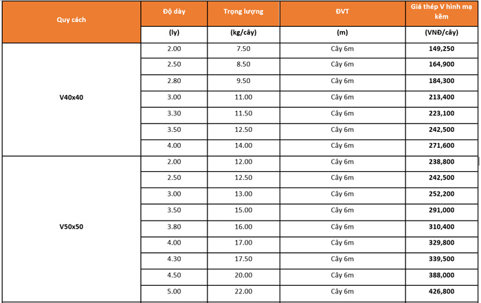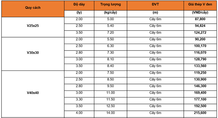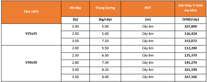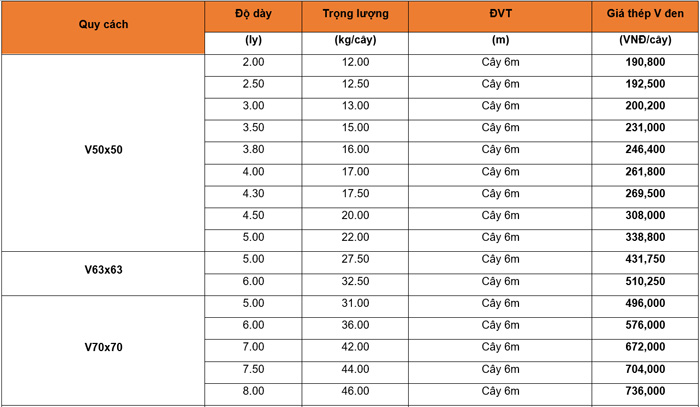 Trên thị trường có nhiều thương hiệu sản xuất thép chữ V, nhưng chung quy có 2 dòng sản phẩm chính là thép V đen và thép V mạ kẽm. Bởi đa dạng về mẫu mã, kích thước, chủng loại nên giá sắt thép chữ V cũng khác nhau. Thời gian gần đây, giá thép hình V trong nước cũng chịu sự tác động của giá sắt thép trên toàn thế giới. Chính vì vậy mà báo giá thép hình V sẽ không giống nhau ở các đơn vị phân phối. Để chủ đầu từ và các nhà thầu biết thêm thông tin về giá thép hình V hiện nay, chúng tôi xin gửi tới bảng báo giá thép xây dựng mới nhất sau đây.