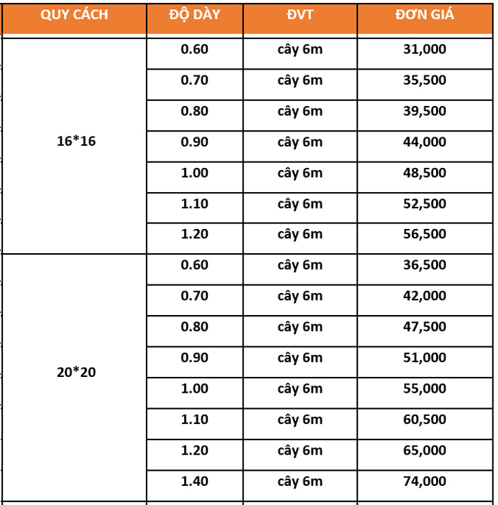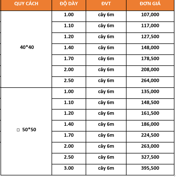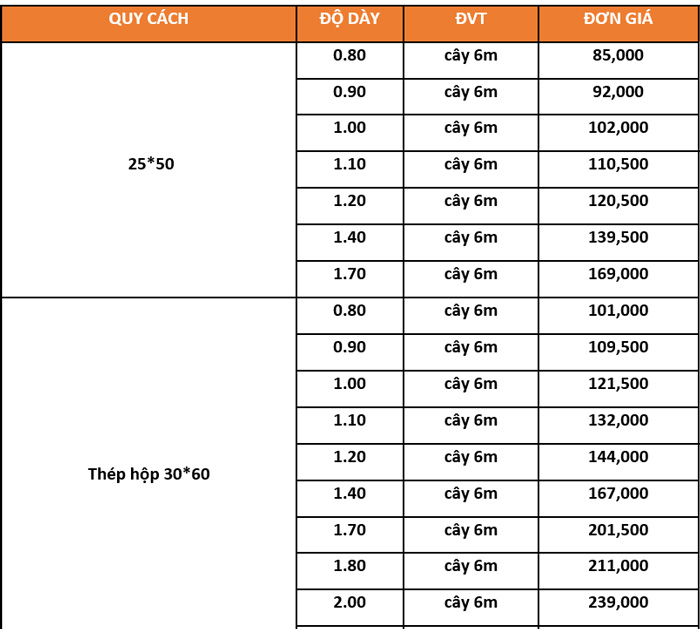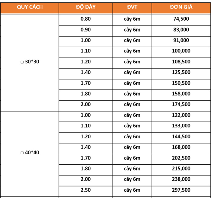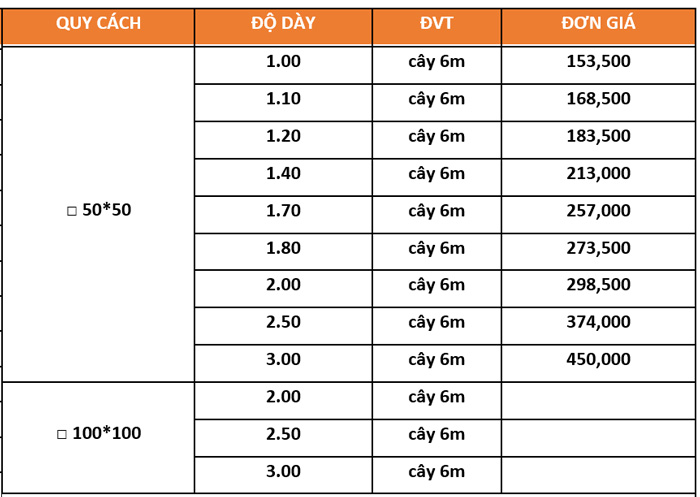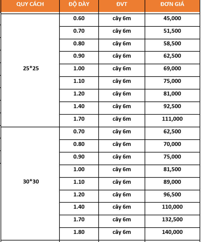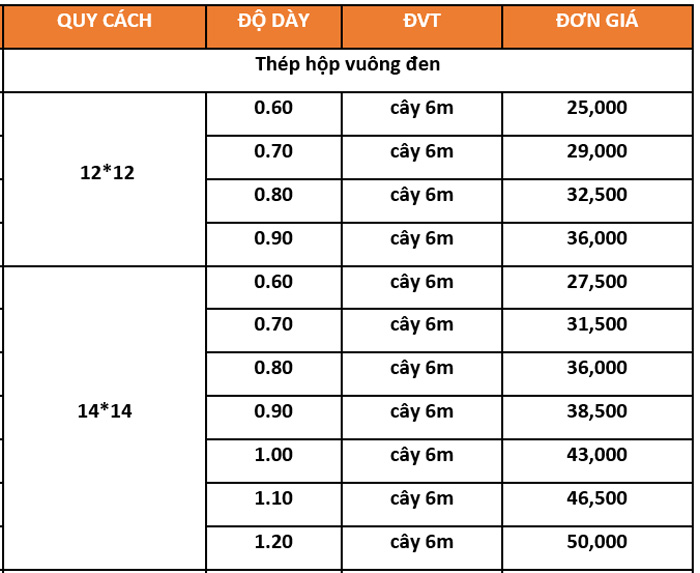 Thép hộp vuông đen có độ bền và tính chịu lực cao và khá nhẹ nên dễ dàng vận chuyển thi công. Loại thép này được sử dụng phổ biến trong xây dựng như làm khung chịu lực nhà cao tầng, làm nền nóng công trình lớn, khung nhà xưởng… Để biết rõ hơn về giá thép hộp vuông đen, các bạn hãy tham khảo bảng sau đây.