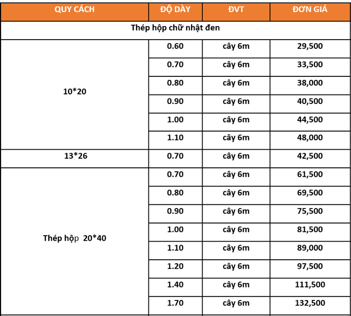 Thép hộp chữ nhật đen được sử dụng phổ biến trong xây dựng dân dụng như nhà xưởng, nội thất... Các vị trí trong nhà ít chịu tác động từ bên ngoài. Ưu điểm của loại thép hộp chữ nhật đen là có chi phí rẻ, phù hợp với công trình trong nhà giúp tiết kiệm chi phí. Sau đây, chúng tôi xen gửi bảng báo giá thép hộp chữ nhật đen mới nhất.