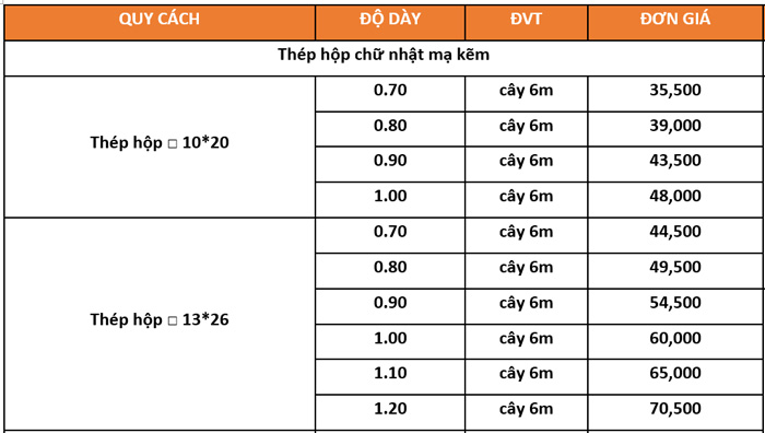 Thép hộp chữ nhật mạ kẽm: là vật liệu xây dựng được hoàn thiện bằng lớp mạ kẽm nhúng nóng. Nhờ lớp vỏ mạ kẽm mà thép hộp chữ nhật mạ kẽm có khả năng chống ăn mòn và xâm thực tốt. Loại thép hộp này được dùng trong nhiều công trình khác nhau như xây dựng công nghiệp, dân dụng nội thất.... Dưới đây là bảng báo giá chi tiết các loại thép hộp chữ nhật mạ kẽm.