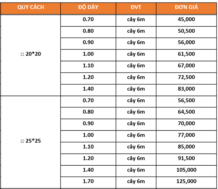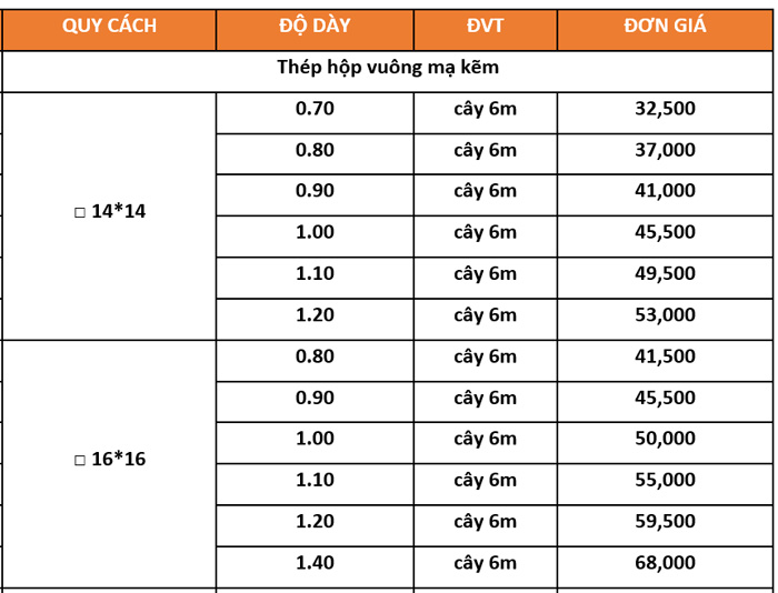 Thép hộp vuông mạ kẽm có lớp phủ bề mặt sáng bóng, có khả năng chống an mòn tốt, thích hợp với các công trình ven biển hay môi trường hóa chất. Loại thép này với rất nhiều quy cách và độ dày khác nhau cũng như kích thước đa dạng, nhiều chủng loại. Giá thành thép hộp vuông mạ kẽm thương đối rẻ, cụ thể như bảng dưới đây.