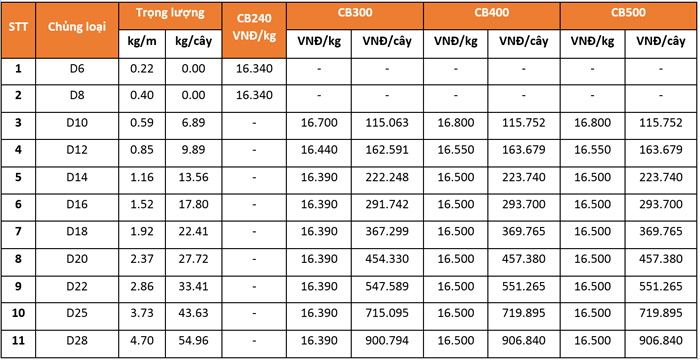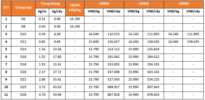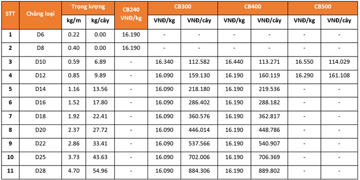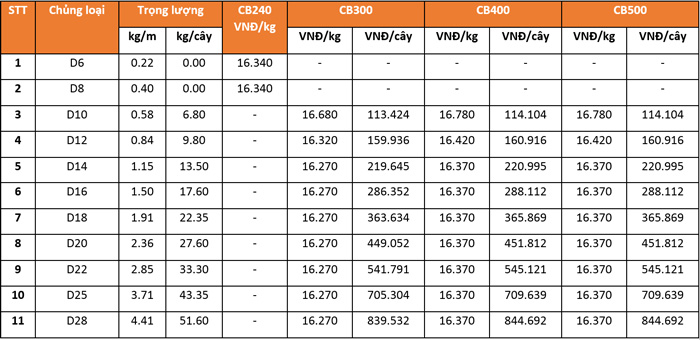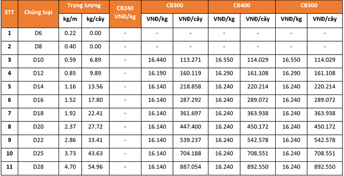 Trên thị trường hiện nay có nhiều loại thép xây dựng khác nhau, nhưng thép Việt Đức vẫn được nhiều khách hàng tin tưởng bởi giá thành cạnh tranh. Để biết rõ hơn về mức giá bán thép Việt Đức 2024, các bạn hãy theo dõi bảng sau đây.