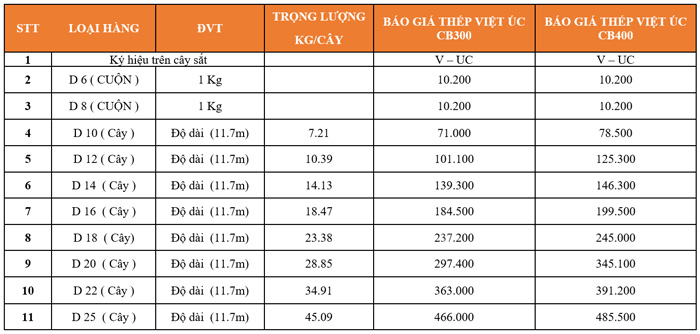 Ký hiệu của thép Việt Úc là hình con kangaroo và chữ v-UC cùng với mác thép CB3. Thép Việt Úc chuẩn sẽ được đóng bó chắc chắn bằng cả đai và nẹp thép. Để các chủ đầu tư cũng như nhà thầu có thêm thông tin về giá sắt thép xây dựng, chúng tôi xin gửi bảng báo giá thép Việt Úc dưới đây.