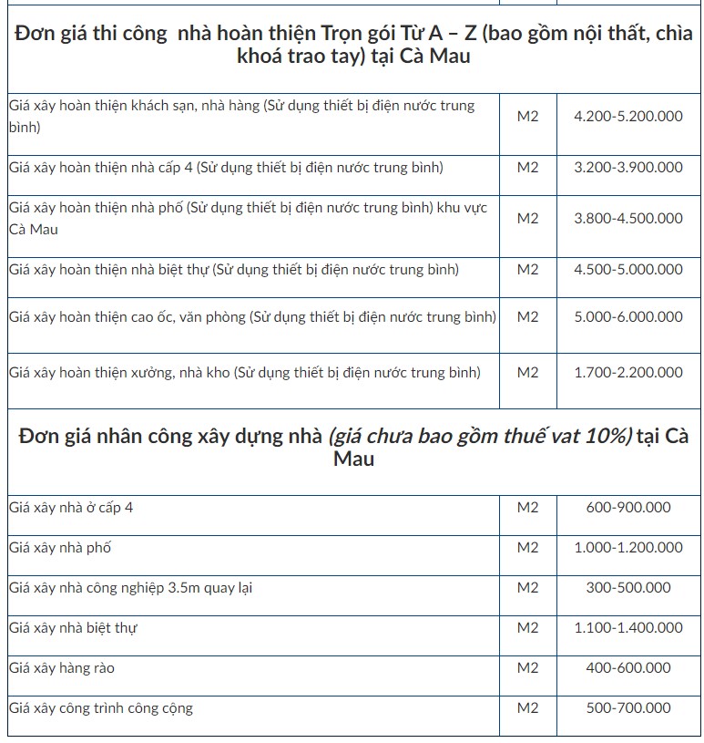 Dưới đây là bảng giá thị trường xây dựng nhà thô hoàn thiện, xây nhà trọn gói tại Cà Mau 2024 mới nhất mà Xây Dựng Số đã tổng hợp được. Mong rằng, qua bảng này chủ đầu tư có thể chuẩn bị được chu đáo nhất để khởi công ngôi nhà của mình.