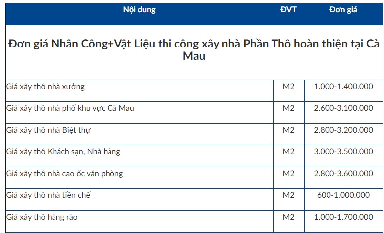 Dưới đây là bảng báo giá phần thô trọn gói tại Cà Mau 2024 mới nhất mà Xây Dựng Số đã tổng hợp được. Mong rằng, qua bảng này chủ đầu tư có thể chuẩn bị được chu đáo nhất để khởi công ngôi nhà của mình.