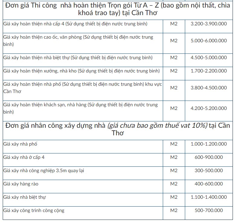 Với mức giá tùy thuộc vào từng địa phương. Nếu như ở thành phố Cần Thơ hoặc những nơi gần với khu công nghiệp như Bình Thủy, Trà Nóc, Ô Môn... thì giá cao hơn so với những nơi ở vùng nông thôn. Nhưng tại thời điểm hiện tại ở Cần Thơ hiện nay có mức chi phí xây nhà trọn gói như sau: