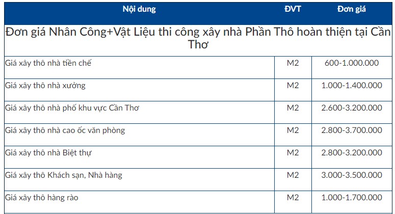 Bảng giá thị trường giá xây dựng nhà phần thô hoàn thiện, xây nhà trọn gói Cần Thơ mới nhất 2024 (tính theo đơn giá m2)