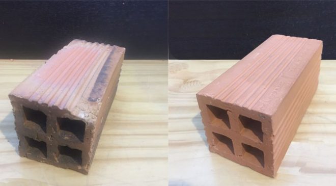 Gạch không đạt chất lượng có màu đen (bên trái) Gạch đạt chất lượng có màu đỏ, đều, không bị cong vênh hoặc nứt nẻ (Phải)