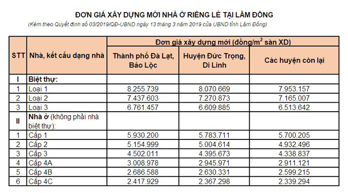Đơn giá xây dựng nhà ở riêng lẻ theo quy định trên địa bàn tỉnh Lâm Đồng