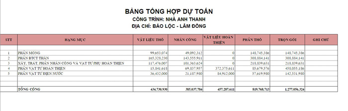 Bảng báo giá phần thô trọn gói tại Lâm Đồng mới nhất 2024