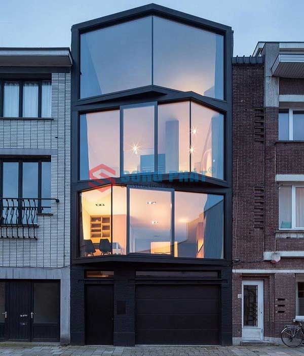 Mẫu thiết kế đầu tiên chúng ta cùng chiêm ngưỡng với vẻ đẹp chắn chắn mà khung thép mang lại. Có sự kết hợp của những song gỗ mịn màng bao quanh căn nhà tạo điểm nhấn. Ở tầng trệt của ngôi nhà được thiết kế gara ô tô. Phía tầng 2 và tầng 3 bên cạnh khung thép là những tấm kính trong suốt. Giúp cho ngôi nhà luôn trở lên thông thoáng.