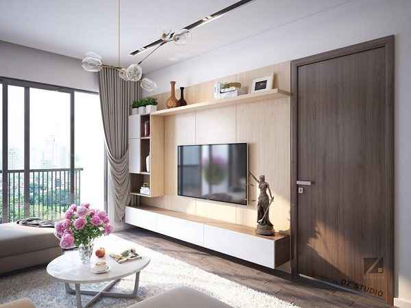 Tiếp theo lại là bản thiết kế nội thất mang phong cách hiện đại cho chung cư nhà doanh nhân trẻ tuổi. Với phong cách phóng thoáng và hiện đại doanh nhân yêu cầu kiến trúc sư công ty thiết kế nội thất theo phong cách hiện đại với đèn chùm 7 bóng trên trần hiện đại. Thiết kế này viti không để kệ mà được thiết kế gắn tường kệ chỉ để trang trí và để đồ cần thiết cho căn phòng khách. Bàn trà được thiết kế bàn tròn. Trang trí lọ hoa hồng tươi rất đẹp tạo không gian phòng thêm sang trọng và hoàn hảo hơn.