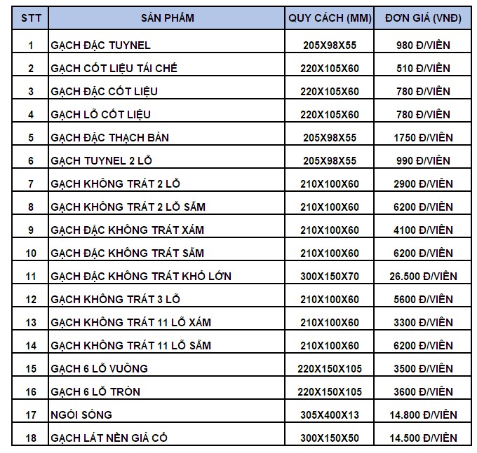 Để chủ đầu tư nắm rõ hơn về giá gạch xây dựng, dưới đây là bảng giá gạch xây dựng mà chúng tôi tổng hợp được.
