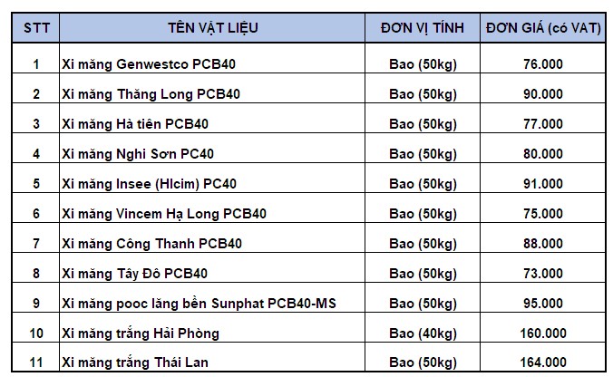 Báo giá xi măng xây dựng: