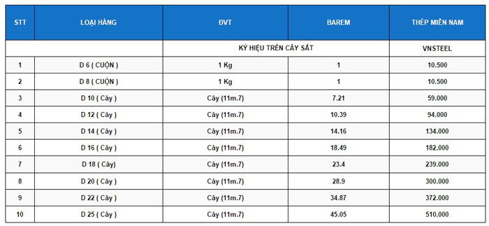 Bảng giá thép miền nam tại Cần Thơ chi tiết