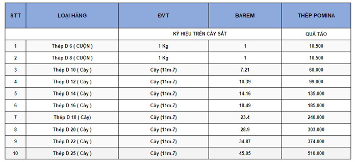 Bên cạnh những thương hiệu thép nổi tiếng khác, thép Pomina vẫn khẳng định được vị thế của mình nhờ vào chất lượng vượt trội và giá cả cạnh tranh. Để nhận biết thép cây Pomina, bạn hãy chú ý đến hình trái táo in nổi trên thanh thép. Bảng báo giá thép Pomina tại Cần Thơ được cung cấp như sau: