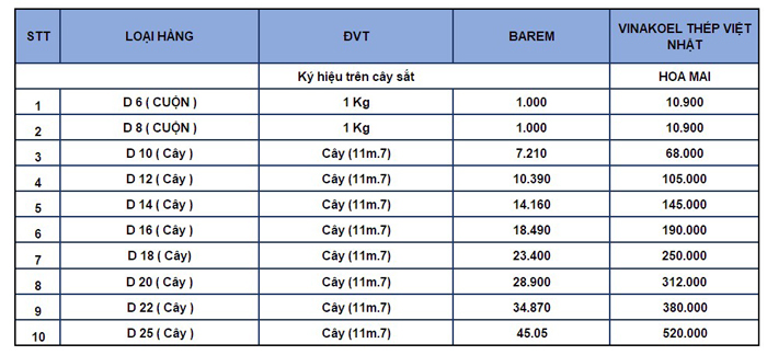 Thép Việt Nhật đang là một trong những loại thép xây dựng được nhiều chủ đầu tư lựa chọn bởi tính năng và chất lượng tuyệt vời. Dưới đây là báo giá thép Việt Nhật tại Cần Thơ: