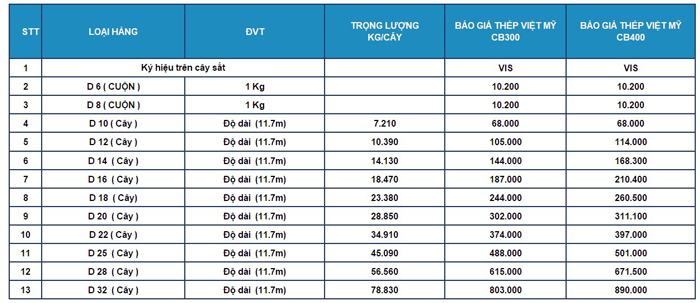 Bảng giá thép Việt Mỹ tại Hà Nam