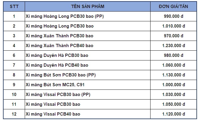 Xây dựng số gửi đến chủ đầu tư báo giá xi măng mới nhất được cập nhật tại Hà Nam như sau: