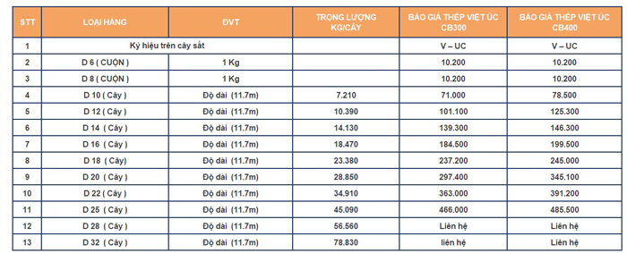 Là một trong những tên tuổi lớn trong làng sắt thép trong nước, vậy nên giá thành thép Việt Úc luôn nhận được sự quan tâm từ các chủ đầu tư. Để giúp bạn có thể nắm bắt được chính xác về giá thành thép xây dựng Việt Úc, chúng tôi xin gửi báo giá theo bảng sau.