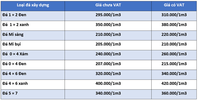 Theo Sở xây dựng tỉnh Hưng Yên, hiện nay giá đá 5x7 là 295.000 VNĐ/m3. Đá 4x6 có giá là 295.000 VNĐ/m3. Đá mi bụi có giá là 285.000 VNĐ/m3. Đá mi sàng có giá là 275.000 VNĐ/m3. Đá 0x4 loại 1 có giá là 260.000 VNĐ/m3. Đá 0x4 loại 2 có giá là 246.000 VNĐ/m3. Sau đây là bảng báo giá các loại đá chi tiết.