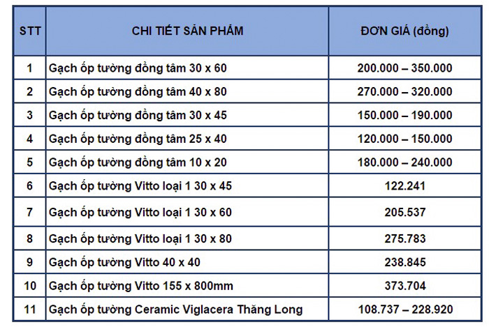 Bảng giá gạch ốp tường