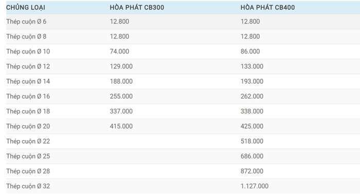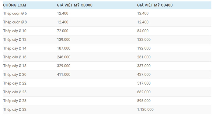 Dưới đây là bảng giá sắt thép Việt Mỹ từng loại tại Thái Bình