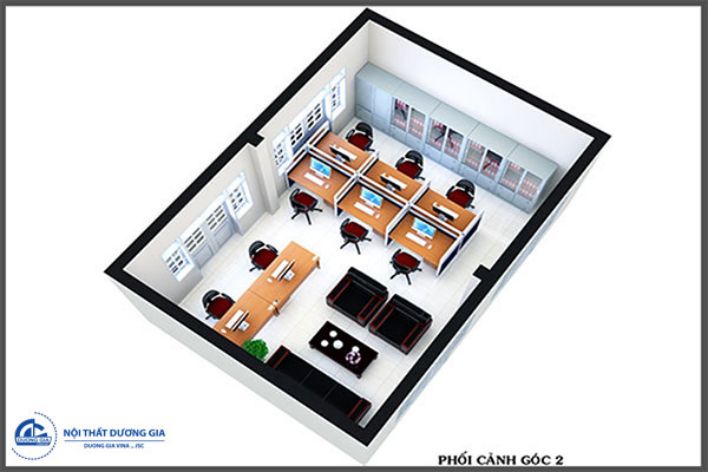 Mặc dù hạn chế về diện tích, nhưng mẫu thiết kế văn phòng 20m2 này vẫn được đánh giá cao bởi đem đến sự tiện nghi cho toàn bộ nhân viên trong công ty. Hơn thế, việc sắp xếp và lựa chọn nội thất cho văn phòng rất khoa học nên đã tạo được độ thoáng, rộng rãi cho không gian văn phòng. Cụ thể, bàn ghế làm việc với kiểu dáng đơn giản nhưng tiện lợi, được bố trí sát tường nhằm đem đến sự gọn gàng, ngăn nắp. Để nhân viên có được không gian trêng khi làm việc, đơn vị thiết kễ đã chọn các vách ngăn làm việc để phân chia vị trí ngồi. Đồng thời, vẫn thể hiện được giá trị thương hiệu của công ty.