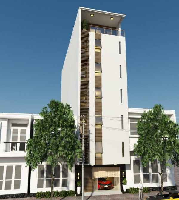 Gợi ý đầu tiên phối cảnh mặt tiền khi tiến hành xây nhà nghỉ 5x20 với kiến trúc hiện đại. Khu vực mặt tiền tầng 1 được ốp đá granit sang trọng, nổi bật với khung cảnh hai bên. Lên đến tầng 2, 3, 4 có cách bố trí giống nhqau với hai bên đối xứng. Có thể nhìn thấy rằng hai bên là hai phòng nghỉ dành cho khách, mỗi bên gia chủ đều cố gắng mang đến ban công nho nhỏ để khách hàng đứng ở vị trí phòng mình hướng mắt nhìn ra toàn cảnh xung quanh. Lên đến khu vực tầng tum của nhà nghỉ 5x20 sử dụng làm che nắng bên trên, tiểu cây cảnh bên dưới tạo nên không gian thông thoáng, màu xanh thiên nhiên bao trùm. Cũng như nói ở trên, gia chủ hoàn toàn bố trí bàn trà, bàn café vừa phục vụ khách nghỉ, vừa có thể kinh doanh.